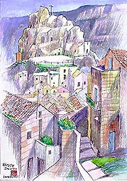 只ひたすらに走るだけではつまらない。途中の山中にモラノ・カラブロ<Morano Calabro>という小さな集落があり【写真】、そこの山頂には古いサンピエトロ寺院とフリードリッヒ2世が造ったといわれる城が残されているらしい。20分位道草していきませんか、という添乗員の提案に全員賛成、バスはその集落へ登る細い道に分け入った。