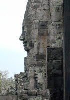 バイヨン寺院のユニークさは、巨大な仏の顔を四面に彫りつけた沢山の塔にある【写真6】。こんな建築様式は、世界の何処にも見られないものである。確かにその顔の表情は、この地方独特のものであり【写真7】、慈悲の力で人々を救済する観世音菩薩の尊顔だと説明されて納得である。際立って横顔の美しい尊像を見つけた【写真8】。そして、すべての尊顔が、穏やかな微笑みをたたえていた。中で最も有名な観世音菩薩の尊顔(200リエル札の絵柄になっている)を、急ぎスケッチさせていただいた【画像参照】。