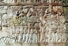 「アンコール・トム」とは、クメール語で「大きな町」と云う意味だそうだ。その町の中心に建つのがバイヨンと呼ばれる仏教寺院であり、王宮や祠堂などの建物も残されていた。バイヨンの回廊は、12世紀当時の人々の様子をみごとなレリーフで表現した一大絵巻物であった。戦いから漁、炊事、将棋や相撲、踊り子、出産シーンまで描かれていた【写真3-4】。 |