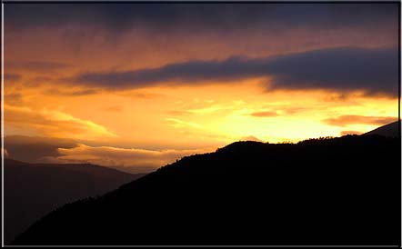 。東の空が黄金色に輝き始めた。しばし車を停めて写真タイム。 煌めく曙光のドラマを期待したが、雲は厚さを増し、小雨が降り出した。 天候は下り坂のようだ。展望の期待は薄れ、がっかりである。その間にも、 ロープウエイ乗り場へ急ぐバスが幾台も追い越して行った。