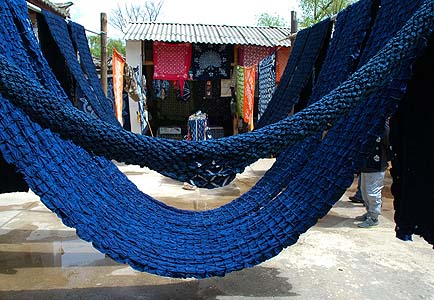 庭一杯に藍染めを干す