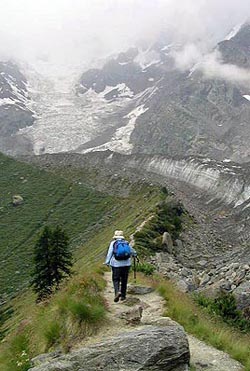 天候は期待に反して、時々小雨の程度。雲が低くてモンテローザの姿は見えない。 ベルヴェデーレ氷河のモレーンを渡る