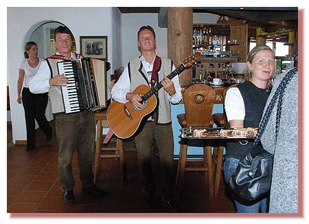 ディナーをお願いしようとしたら、今夜だけは受けられないという。しかし今夜は、山の上のレストランでチロル音楽とダンス付きの夕食会が、たったの8ユーロで開催されることになっている。バスの送迎もついているが、どうだ、と勧められた。ダンス付きとは、土地の舞踊を鑑賞出来るということだろうか? 詳細は分からないが、楽しそうである。喜んでOKする(写真左)。