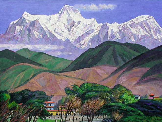 | ポカラ空港の空港ターミナルの屋上に上がると、ダウラギリ、アンナプルナ、マナスルという8000メートル級のヒマラヤの山々が並んでいるのを間近に眺めることが出来ます。絶好の展望台なのですが、観光目的の開発は行われていないのでお客の姿は少なく、集中して描く事が出来ました。現場では水彩で取材。帰国後油彩で仕上げたものです、翌年、日本山岳画協会展に出品しました。 |