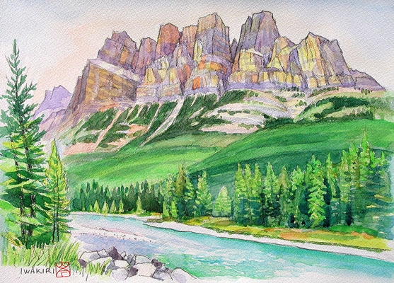 | ボウ川に架かる白い鉄橋のそばで車を停めました。此所から眺めるキャッスル山が、なかなかの風格だったのです。川べりまで降りて、見上げる姿も堂々たるもの。雲が厚くて陽は差しませんが、一応全貌を見ることが出来るので、腰を据えて写生に取り組むことにしました。防寒着を着込んで河原に座り込みましたが、寒さに手がかじかんでしまいました。時々、雲間から射るような光りが走りましたが、最後まで青空が広がることはありませんでした。 |
