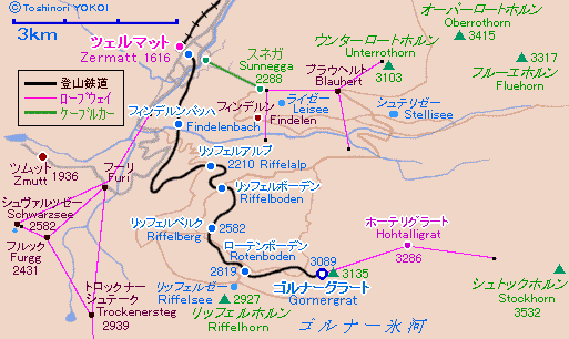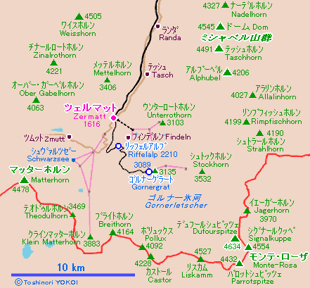 9時頃、登山鉄道駅には多くの人たちが列を作っていた。皆、溌溂としており華やいだ雰囲気が気持ち良い。終点のゴルナーグラートまで40分位だが、今日は格別の天候である。森林限界のリッフェルアルプあたりを過ぎる頃、白いマッターホルンが視界に飛び込んでくる【写真下左】。「ホーッ!」声にならない感動が車内に満ちた。終点近くからミシャベル山群 <Mischabel>【写真下右】も美しく展望出来て、時間の経過を忘れていたようだ。 |
