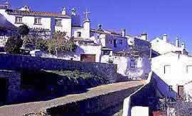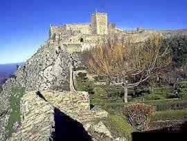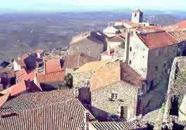 マルヴァンは、スペイン国境から10キロ離れた山上に在る小さな町です。海抜860メートル余りの山頂は、ぐるりと城壁に囲まれており、一番奥まった山頂部分にお城があり、その周りは切り立った断崖です【写真下左】。自然の要塞そのものに見えます。お城の前に小さな小学校や教会があり、それらを支えるようにして住居が日当たりの良い斜面に建ち並んでいます。道は石で敷き詰められており、すべての家も石で造られています。白い壁、そして赤い屋根、適当に緑の木々も配された家並みの眺めは、青く澄み切った空を背景にして落ち着きとカラフルな美しさに光り輝いていました【写真下右】。朝食もそこそこにして、スケッチに精をだしました。 |